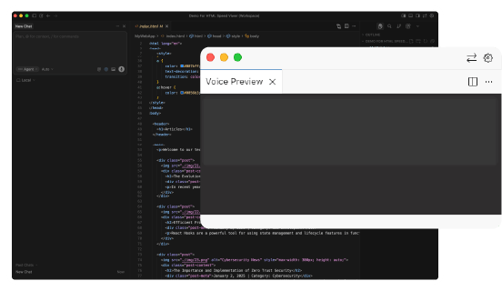 A. Voice Preview is the TTS (text-to-speech) feature included in the HTML Speed Viewer Plus Plan. It lets AI agents like Cursor, Codex CLI, and Copilot play responses as high-quality audio.
